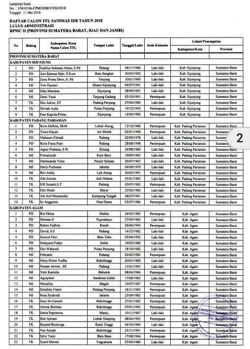 Berikut ini informasi Pengumuman Hasil Seleksi Tahap Administrasi Tenaga Fasilitator Lapangan (TFL) Sanimas IDB Tahun 2018 Regional II – Provinsi Sumatera Barat, Riau, Jambi.